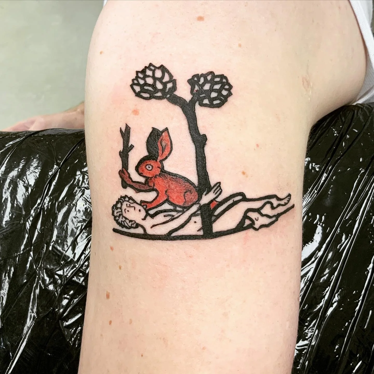 Iâve always been drawn to imagery like thisâthose strange corners of history with humor, ambiguity, and a touch of mischief. This rabbit came from one of those manuscripts, and Jacob actually asked me to tattoo it in red. That little shift gave it a sharper, almost devilish edgeâplayful but with a darker undertone. Even though the image is hundreds of years old, it still feels alive, like itâs winking at us, fully in on the joke.