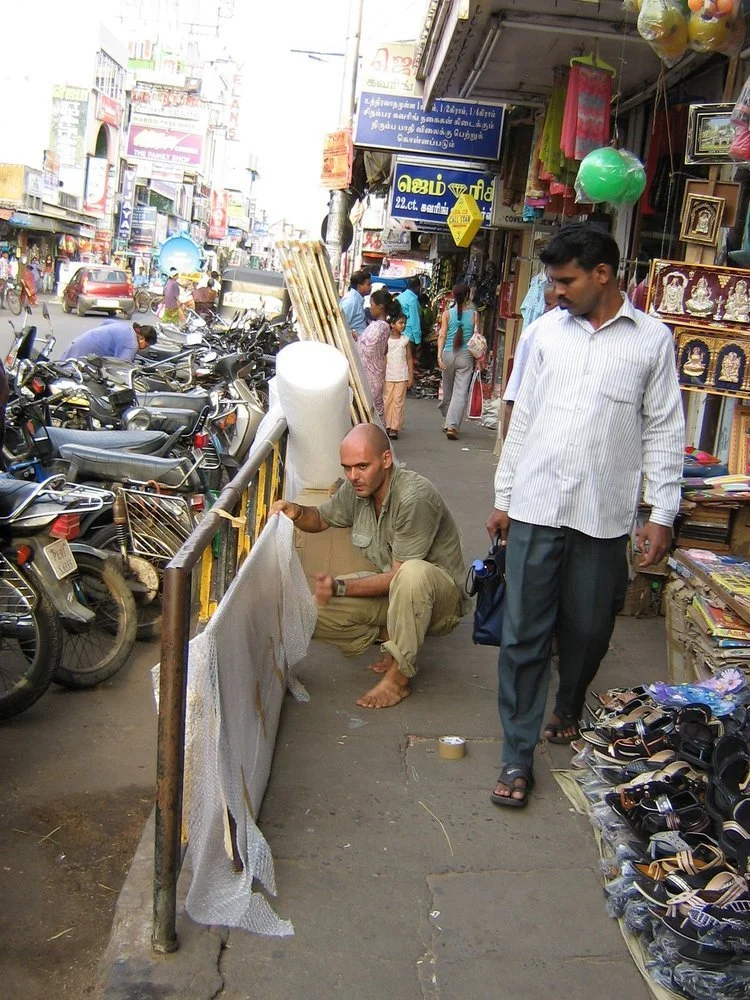 Außerdem nahm er Kontakt mit einem indischen Künstler auf, Gobi. Dieser lebt in Auroville von seiner Malerei, die er an Touristen verkauft. Gobi baute alle Holzrahmen und bespannte sie mit Leinwand. Seine Rahmen stellen also die physikalische Grundlage Jorges Arbeiten dar.